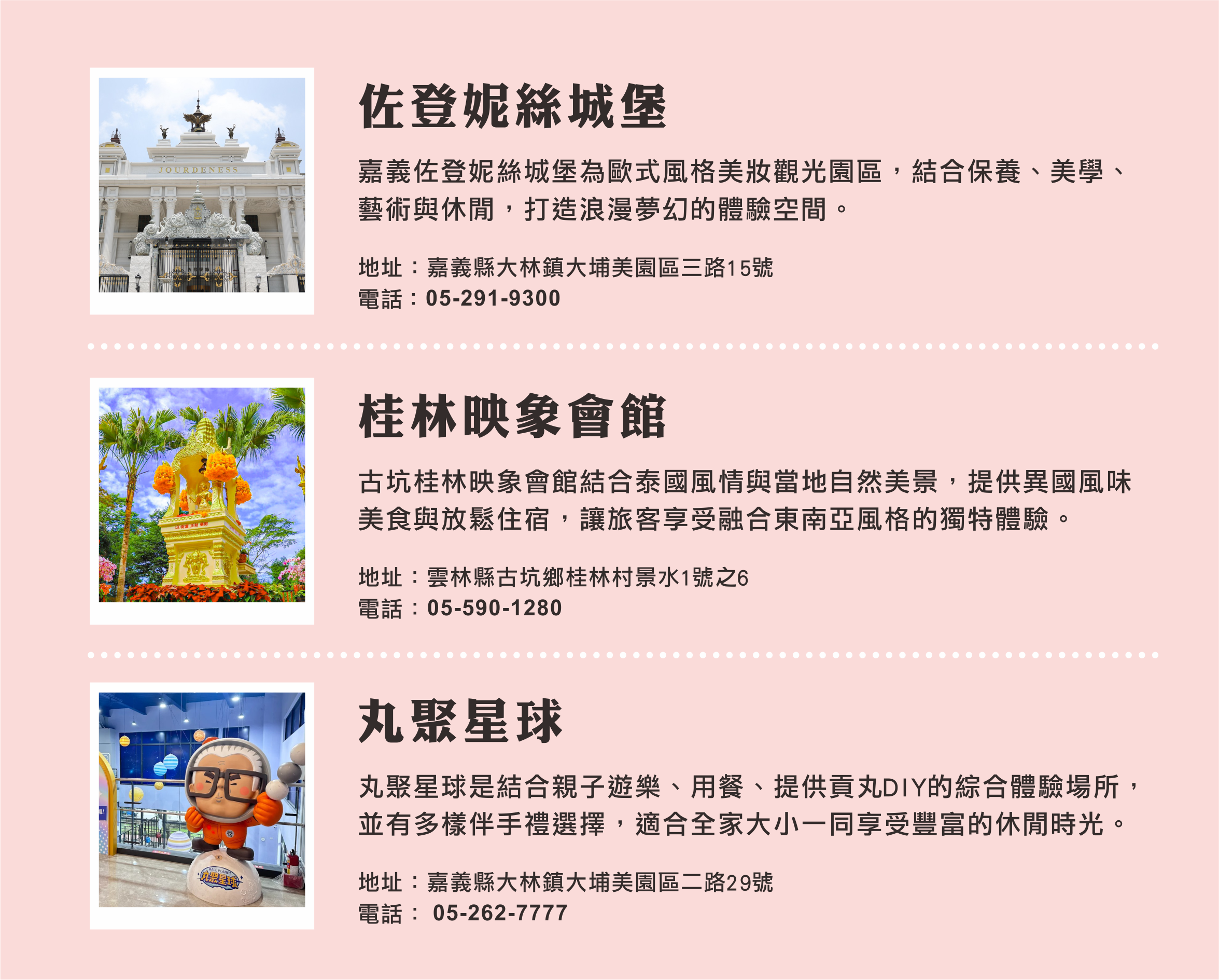 - 獨特體驗: 包含「桂林映象會館」體驗異國風情的泰國景觀餐廳、擁有歐式風情的「佐登妮絲城堡」、好吃又好玩的「丸聚星球」特色貢丸觀光工廠,讓您一天玩不完~~