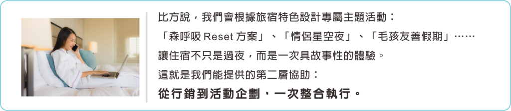 旅宿老闆通常懂硬體、懂服務,但不一定懂「如何讓旅客想訂房」。活動企劃就是關鍵。